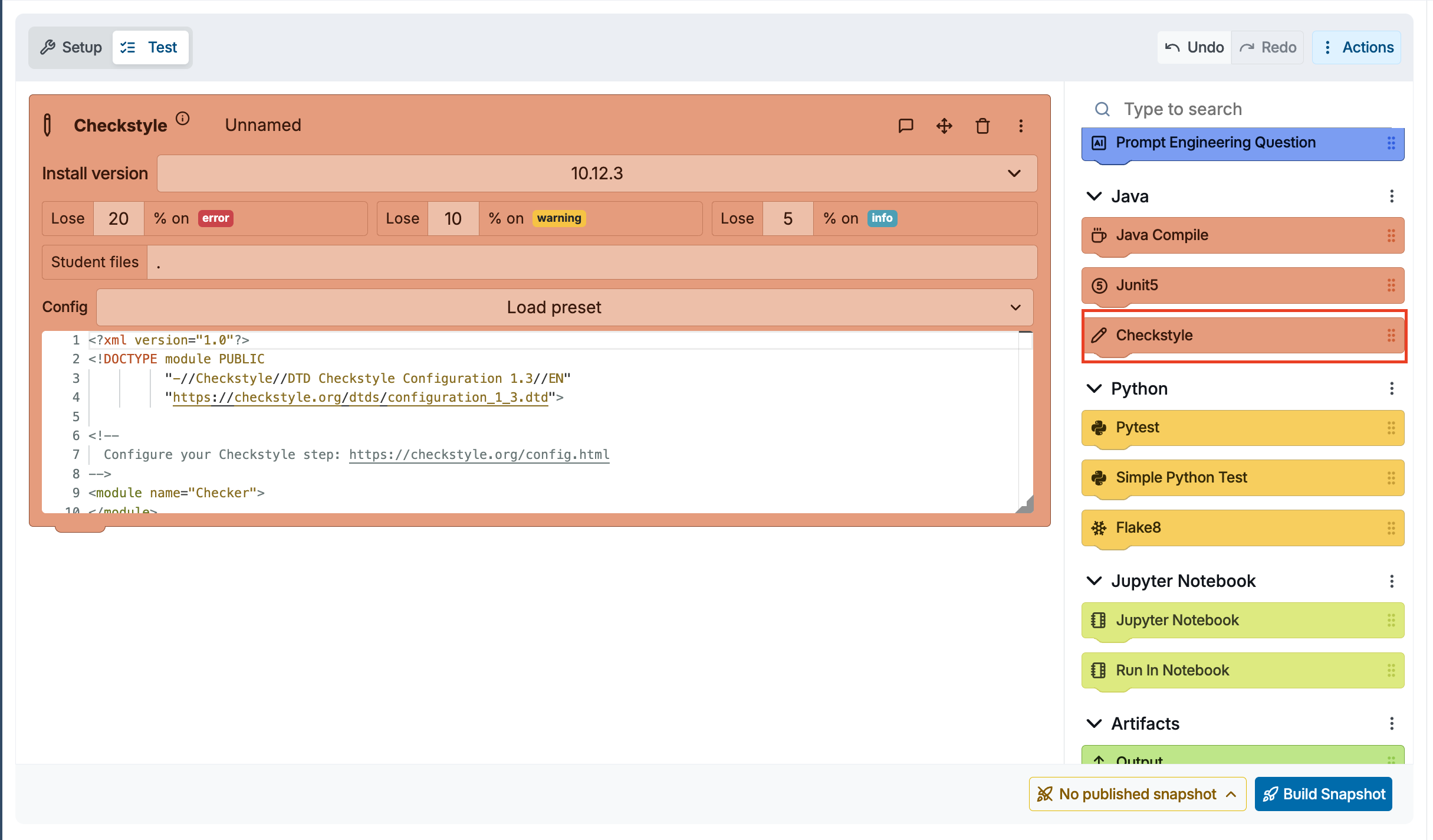 Setting up code quality assessment in CodeGrade is not a big technical lift. The AutoTest editor lets you drag and drop blocks. Adding a Flake8 block, a Checkstyle block, or a Code Structure Test is the same as adding any other test — pick the block, configure it, done.